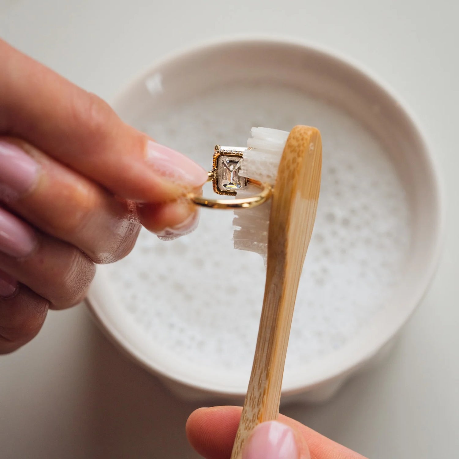 When it comes to at home cleanings—keep it simple. Whether you have a collection of cleaning products, or nothing but the basics, we’ve laid a quick method to keep your jewelry shining it’s brightest at home, or on-the-go.Soak your moissanite jewelry in warm water for 10 minutes with gentle dish soap. Grab a soft toothbrush and gently scrub those hard-to-reach areas (while being cautious around the prongs). Once your jewelry is looking its best, you can rinse it off and leave it to dry. We recommend you perform weekly routine cleanings on your gemstone and gold jewelry.