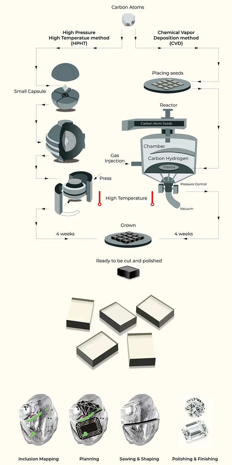 The two main procedures commonly used to create lab grown diamonds are High Pressure High Temperature (HPHT) and Chemical Vapor Deposition (CVD). Both methods simulate the earth's natural processes to create beautiful diamonds in a strictly managed laboratory setting.