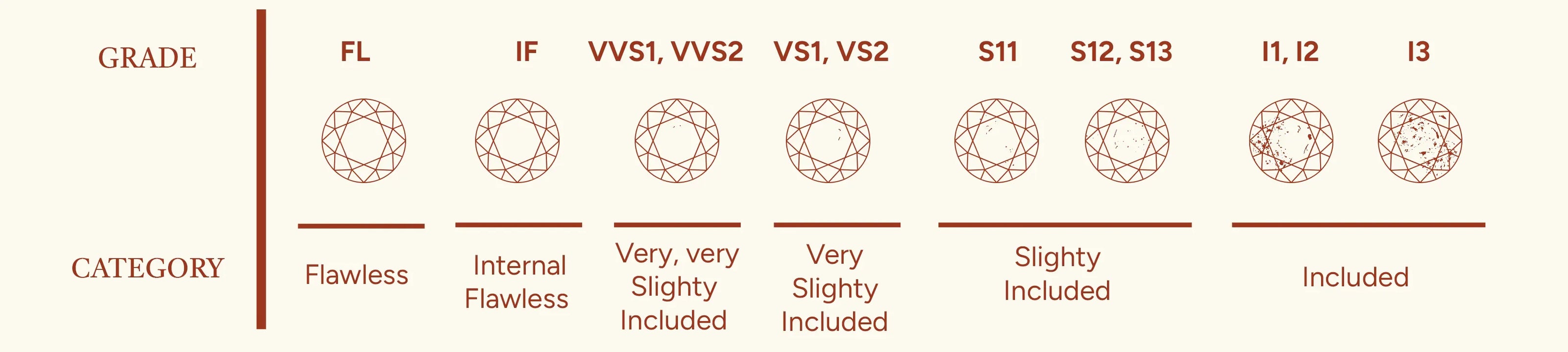 The clarity grading scale runs from Flawless (FL) to Included (I3). Some grades have different categories within the grade, like Very Very Slightly Included 1 and Very Very Slightly Included 2. The higher the number after grading, the more inclusions will be visible on and within the diamond.