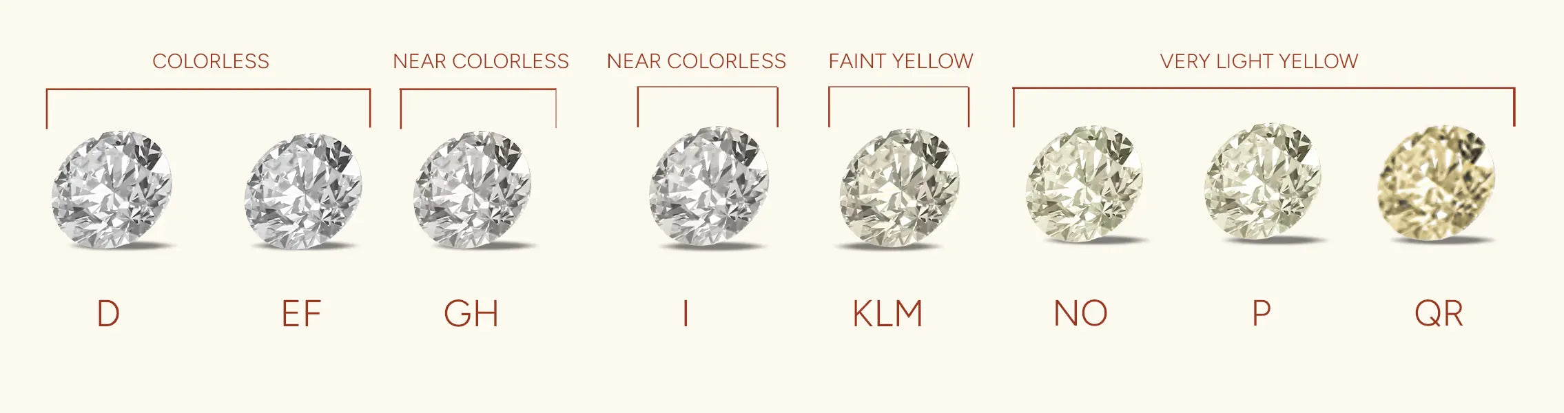 - Near colorless diamonds are grades G-J. Diamonds in this range appear colorless when viewed face up but will display trace amounts of colors if viewed face down against a white background. The color will not be visible to an untrained eye once mounted. Near colorless diamonds provide excellent value for money.