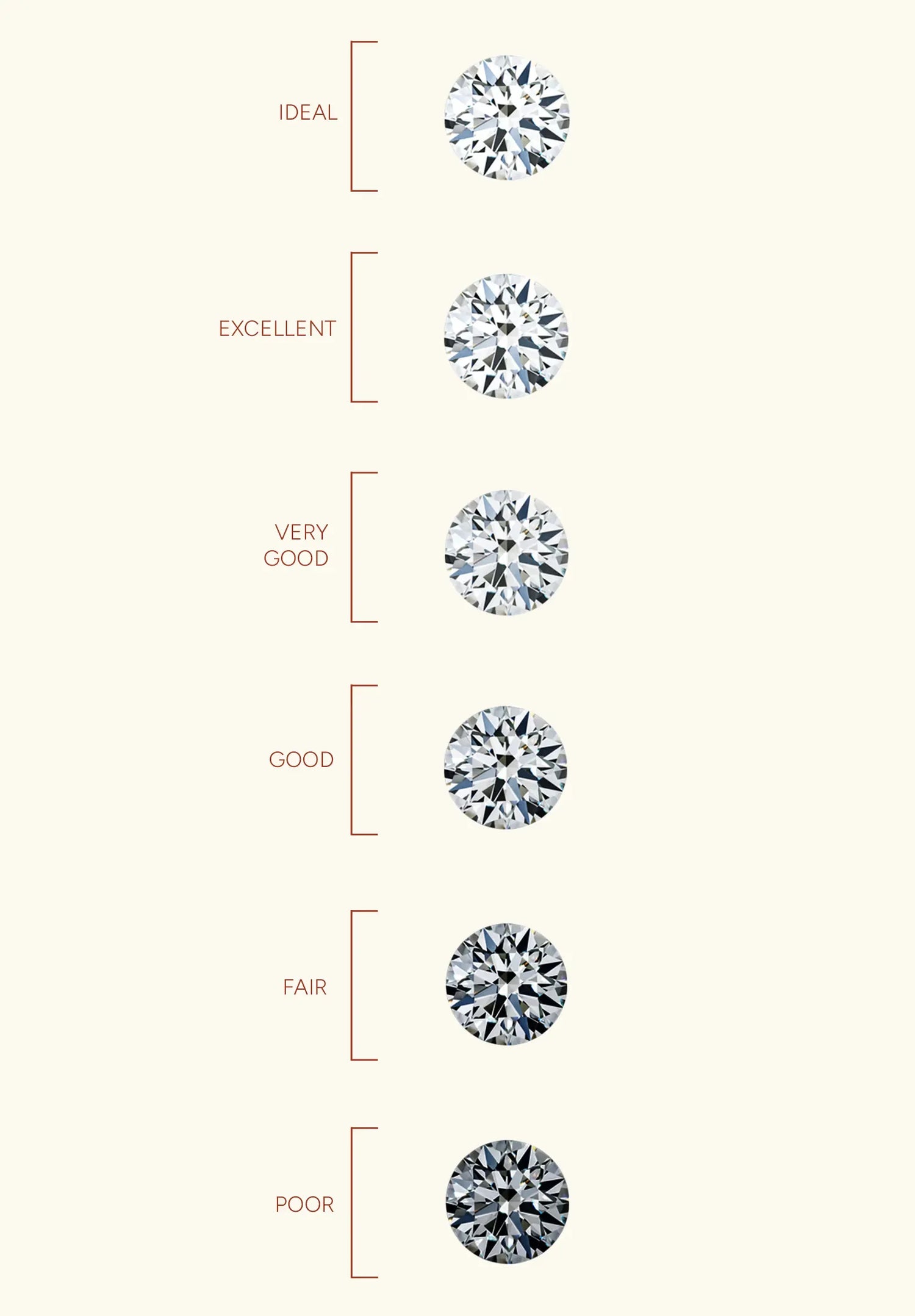 - Poor Cut diamonds appear dim and asymmetrical, with uneven spots on their surface.